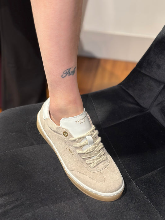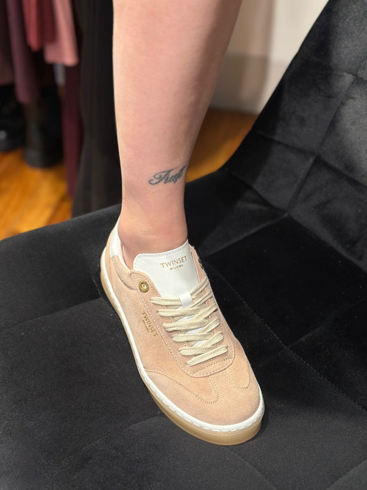 Scarpe da tennis in pelle con logo bianco e oro Pinko