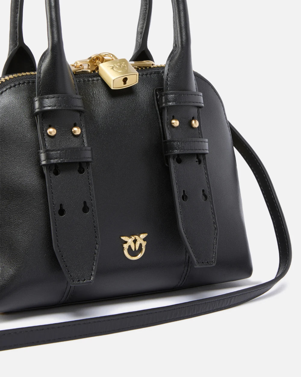 Borsa bowling a mano Mini Escape Bag dalle piccole dimensioni in morbida pelle, dotata di fodera in cotone e tasca a parete completa di portacarte. Caratterizzata dalla tracolla regolabile in pelle e da un doppio manico per la portata a mano o a spalla, la borsa risulta estremamente versatile e pratica. La chiusura superiore con zip a doppio cursore è personalizzata con un dettaglio inedito: un lucchetto decorato dall'iconico logo Love Birds che può essere aperto e chiuso grazie alla chiave contenuta nel charm in pelle che completa la borsa. Attiva la tua borsa PINKO: verifica l'autenticità del tuo prodotto e accedi all'esperienza personalizzata avvicinando il tuo smartphone al ricamo Love Birds che trovi sul retro della borsa!