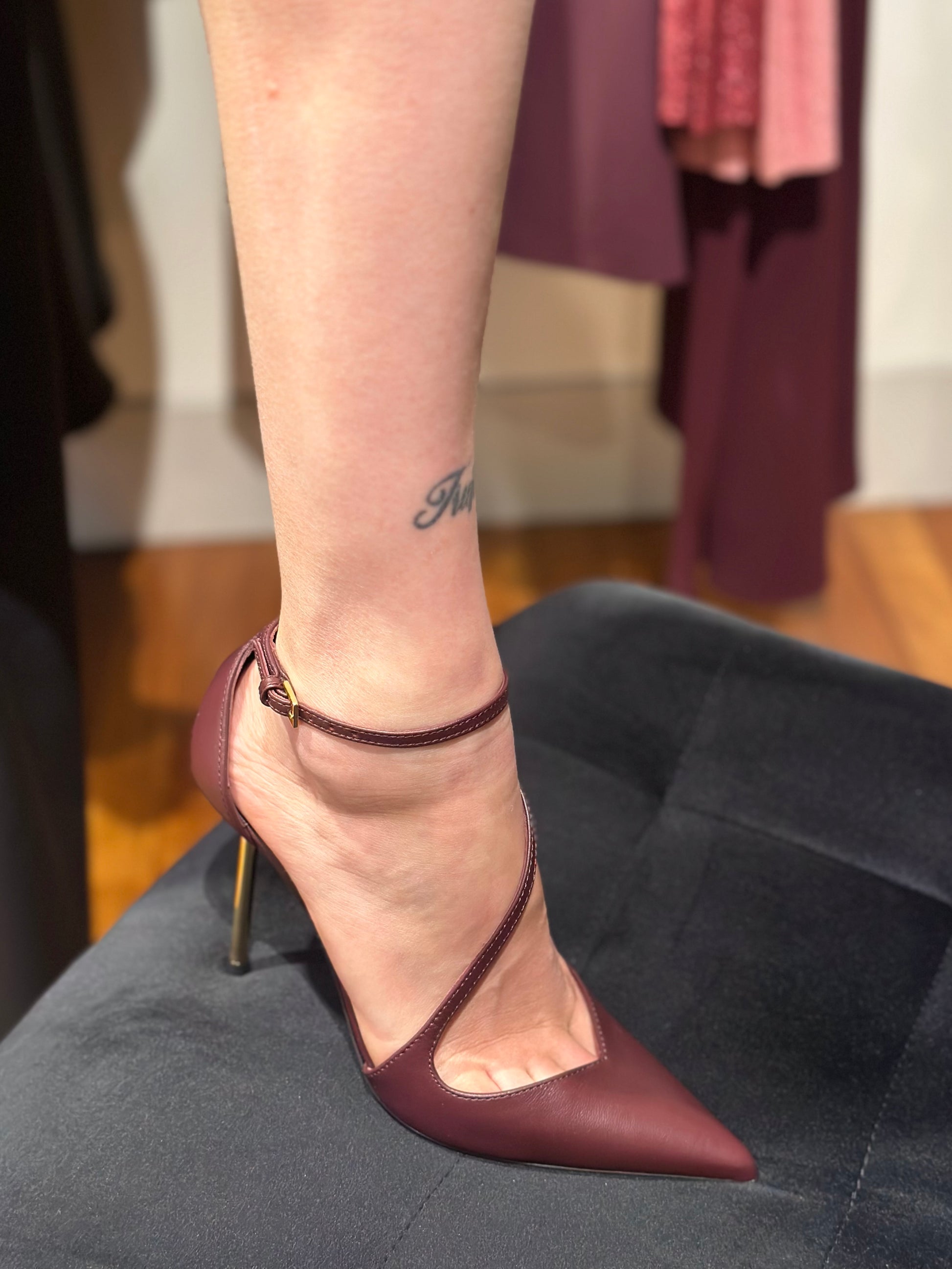 Questa décolleté Ninalilou in morbida nappa è un’espressione di femminilità decisa e sofisticata. La silhouette affusolata con punta slanciata esalta la figura, mentre i cinturini incrociati avvolgono il piede con eleganza e stabilità. Il cinturino alla caviglia aggiunge un dettaglio raffinato, mentre il tacco Helen dorato illumina il design con un tocco moderno e sensuale. Ideale per serate esclusive e look da occasione, è la scarpa perfetta per distinguersi con charme e personalità.