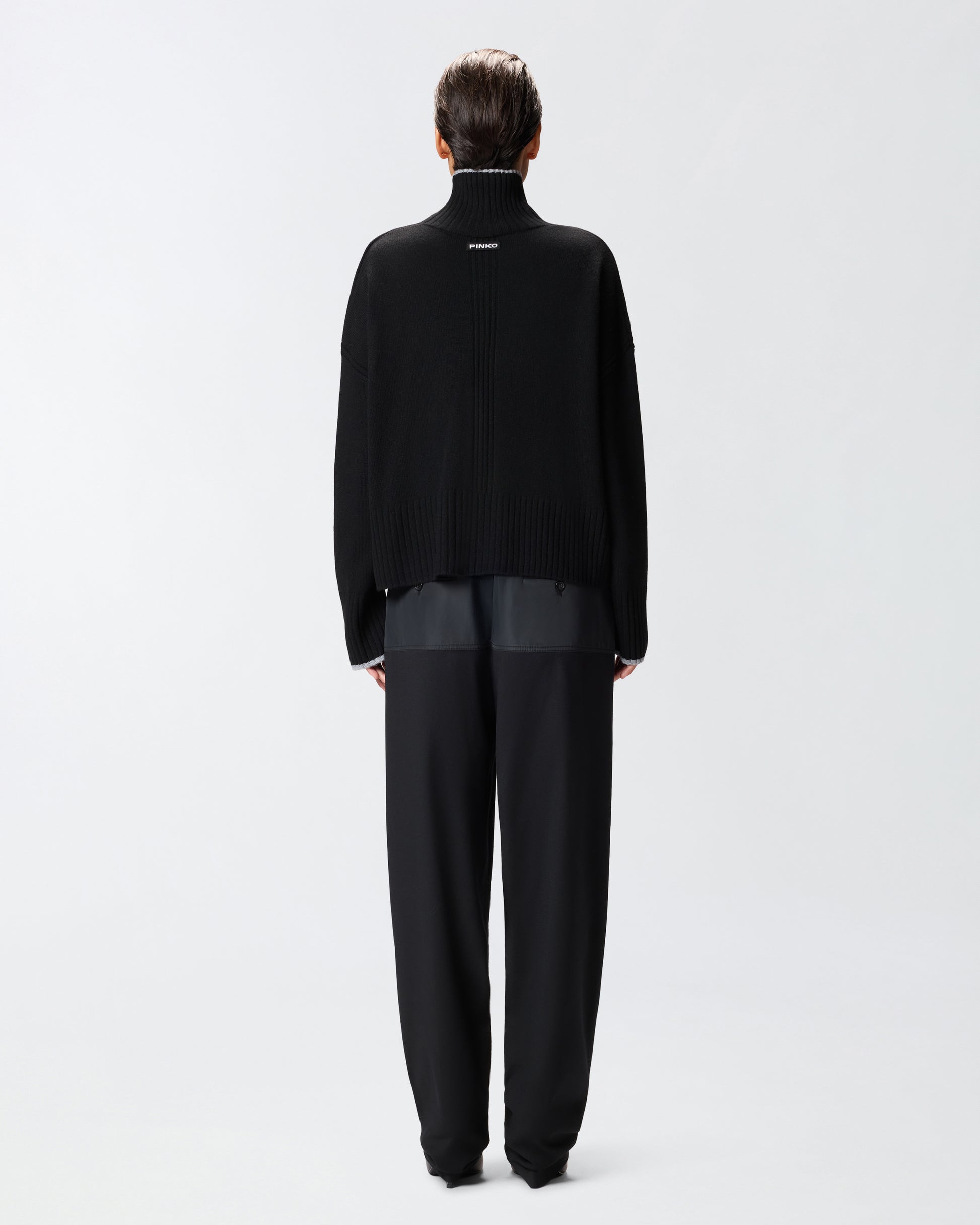 Dolcevita a maniche lunghe in misto lana merino e cashmere, ideale per scaldare i tuoi outfit della stagione fredda. Essenziale e contemporaneo, questo design diventerà il protagonista indiscusso di tutti i tuoi outfit, qualunque sia l'occasione. Il filato a contrasto su scollo e polsini dona un tocco di vivacità al design. Scollo, orlo e polsini sono lavorati a coste, mentre il tocco finale è dato dall'etichetta con logo lettering PINKO sul retro. Il capo è stato sottoposto a prove di finissaggio per ridurre al minimo la possibile formazione di pilling, garantendo una maggiore morbidezza e durabilità del tessuto.