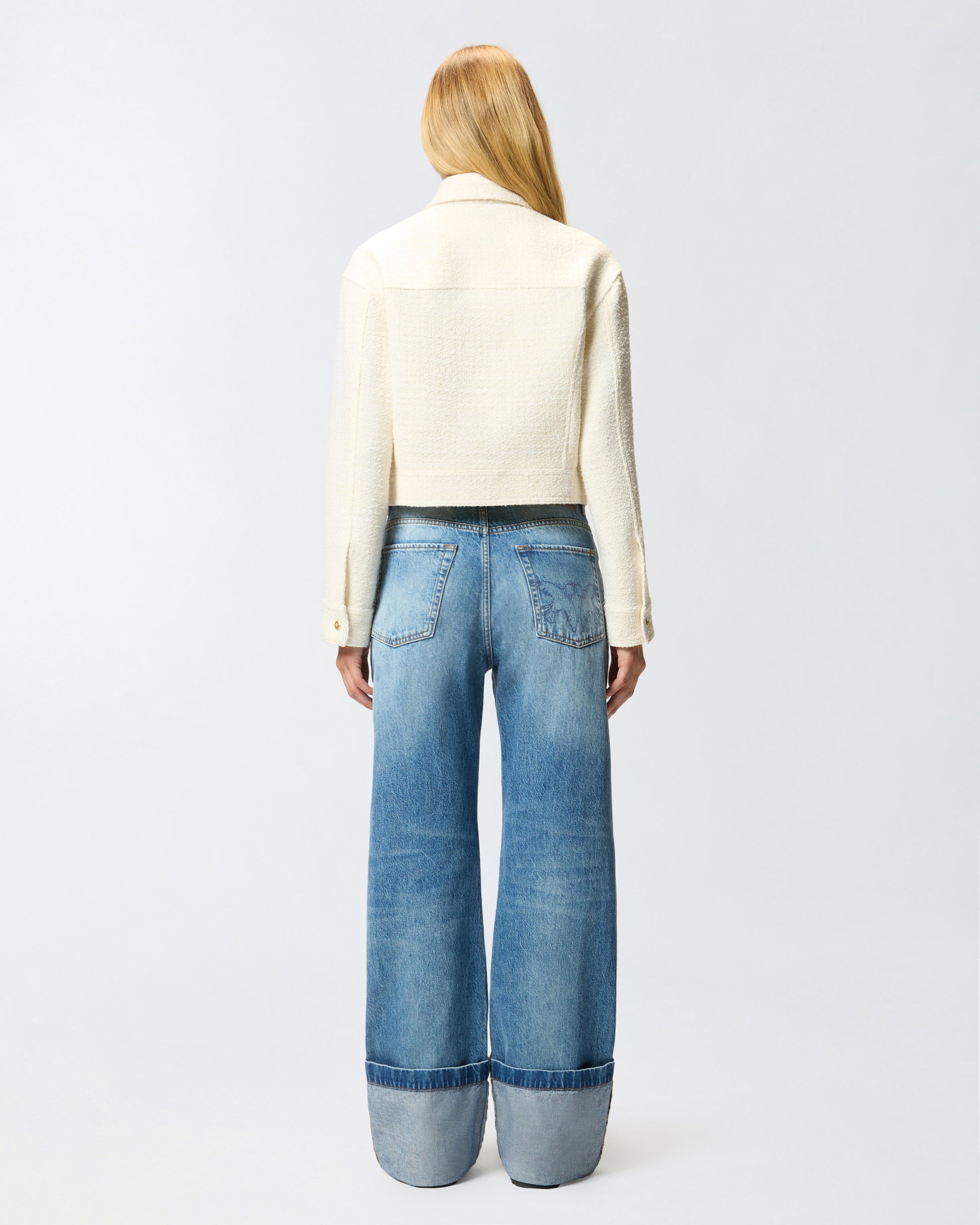 Giacca corta trucker regular fit in tessuto bouclé di misto cotone e lana. Il capo è caratterizzato da tasche inserite nel carré davanti con pattine ispirate al mondo denim e chiusura frontale con bottoni in metallo, ripresi anche sui polsi delle maniche lunghe. Il carré e i tagli sul retro offrono una maggiore libertà di movimento accarezzando la linea dei fianchi. Perfetta con un paio di jeans o con la minigonna a portafoglio abbinata.