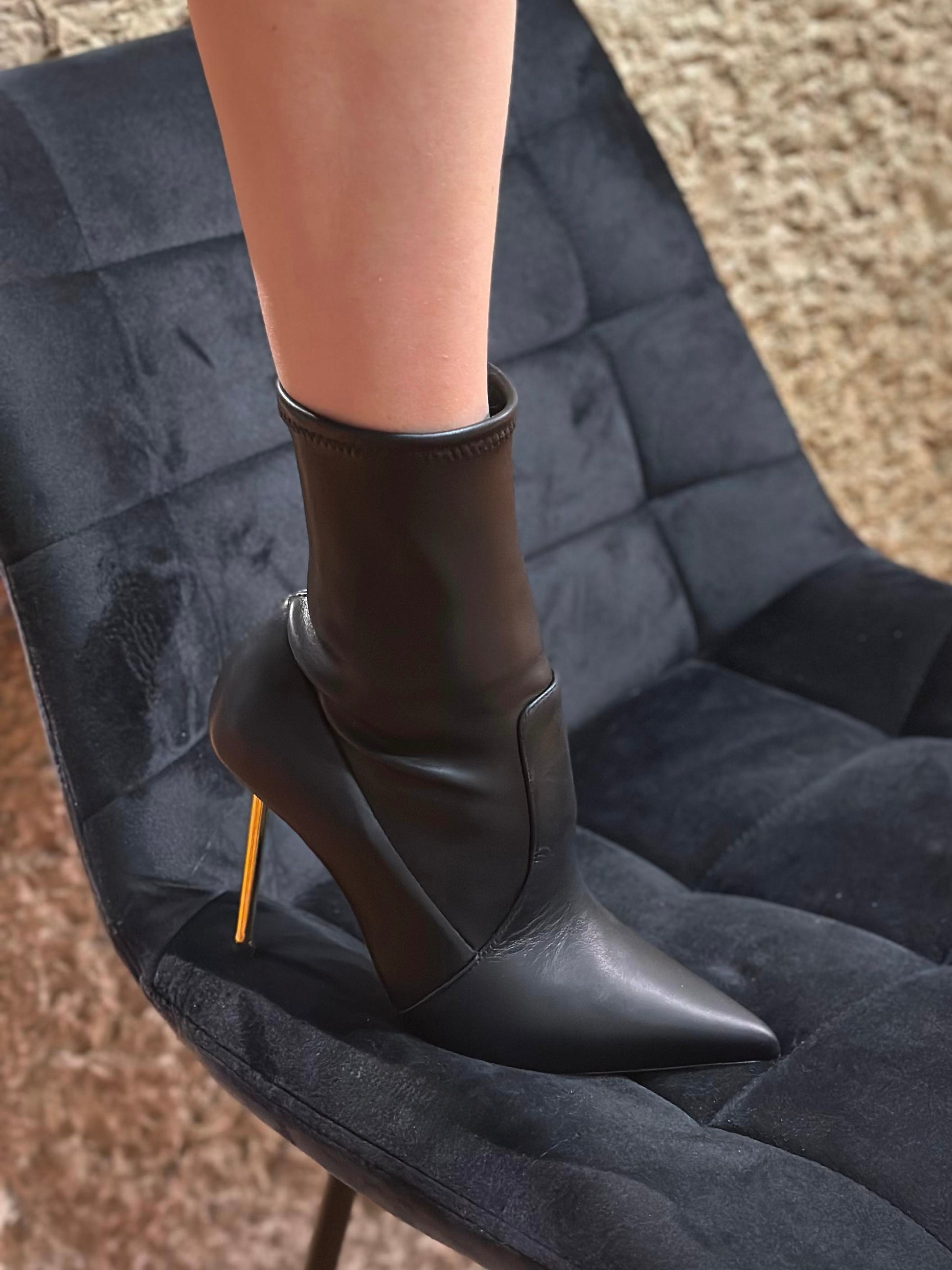 Questo tronchetto Ninalilou in nappa stretch è una dichiarazione di stile audace ed essenziale. La linea avvolgente slancia la gamba con eleganza, mentre la punta affusolata dona un tocco di sofisticata femminilità. Il nuovo tacco Helen cromato, sottile e scultoreo, aggiunge luce e carattere al design, creando un equilibrio perfetto tra modernità e sensualità. Ideale per look metropolitani e outfit da sera, è la scelta perfetta per chi desidera distinguersi con classe e personalità.