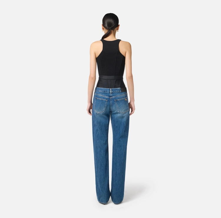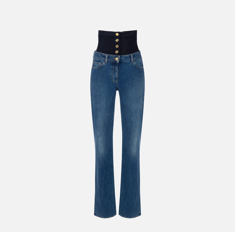 Pantaloni in denim con costruzione loose a cavallo basso. Si distinguono per la fascia in neoprene che sormonta la vita, definita da tagli di ispirazione bustier e illuminata da bottoni in metallo dorato. L'etichetta e la placca con logo sul retro completano il capo. Vestibilità over.