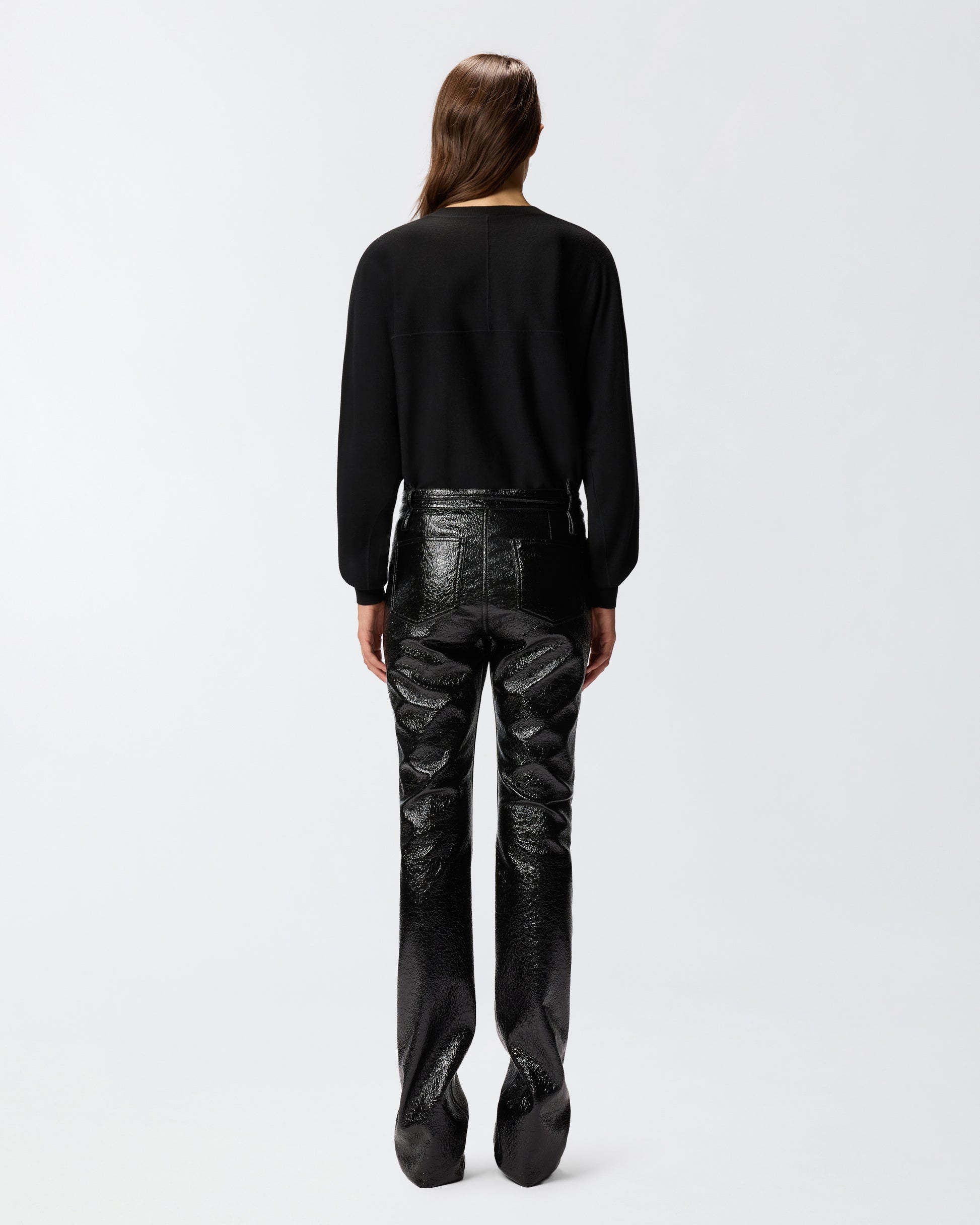 Maglia girocollo a maniche lunghe in pura lana merino, estremamente leggera e versatile. La parte frontale è caratterizzata dall'iconico logo Love Birds sotto forma di intarsio in trasparenza lavorato con tecnica dévoré che esprime appieno il DNA del brand. Il retro del capo, invece, sfoggia una cucitura a vista che ricorda la forma di un carré. Girocollo, orlo e polsini sono lavorati a coste. Il capo è stato sottoposto a prove di finissaggio per ridurre al minimo la possibile formazione di pilling, garantendo una maggiore morbidezza e durabilità del tessuto.