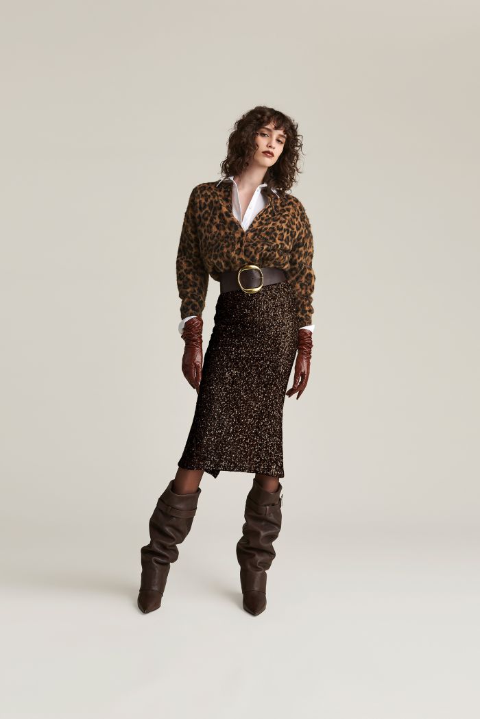 Realizzata in tessuto full paillettes, la gonna Luxy crea un gioco di luci sfaccettate che interpreta con sicurezza le serate più glam. Il fit a tubino esalta le curve con una linea essenziale e decisa.