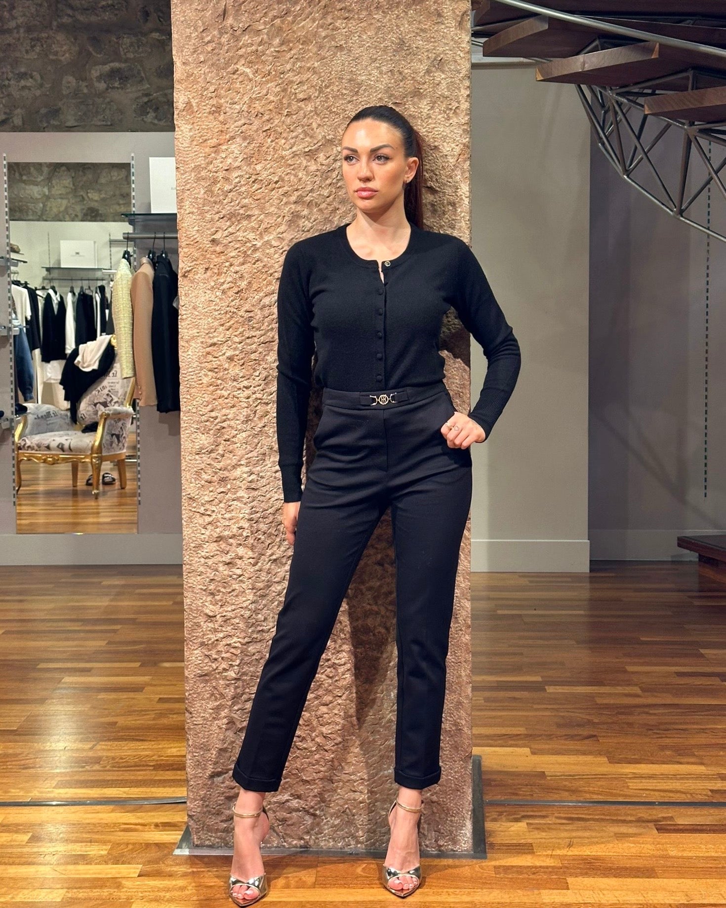 Pantalone slim chino , vita alta con cintura con accessorio metallico, tasche alla francese, tasche a filetto sul retro, e con fondo dritto con risvolto.