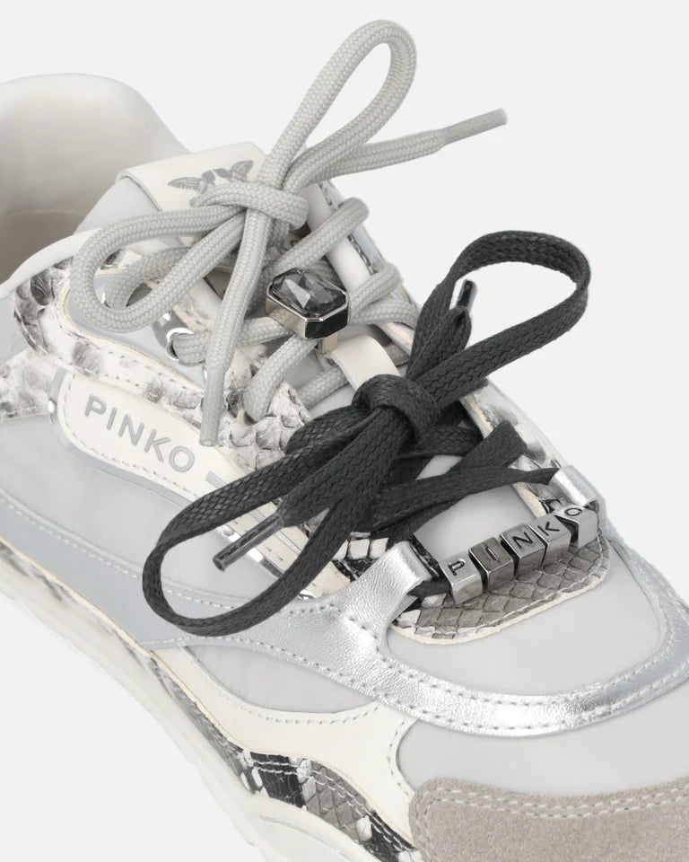 Scarpa da ginnastica caratterizzata da un raffinato gioco di contrasti dato dai doppi lacci di colore diverso e dall'accostamento di tessuto tecnico, dettagli in suede, inserti in pelle laminata e inserti con stampa pitone. Il logo con gli uccellini Love Birds rifinisce la linguetta e il tallone dall'effetto specchiato, mentre l'iconico logo lettering PINKO figura sull'inserto laterale e sugli anelli metallici che arricchiscono i lacci sul davanti. I lacci superiori sono invece completati da un brillante gioiello incastonato su una scarpa e da un charm dall'effetto marmorizzato sull'altra. Al suo interno, il modello presenta un fussbett da 10 mm in latex per un’ammortizzazione perfetta, mentre la comoda suola in gomma assicura grip. Una visione contemporanea della calzatura sportiva reinterpretata in chiave PINKO, per distinguerti con stile anche nei tuoi outfit quotidiani.